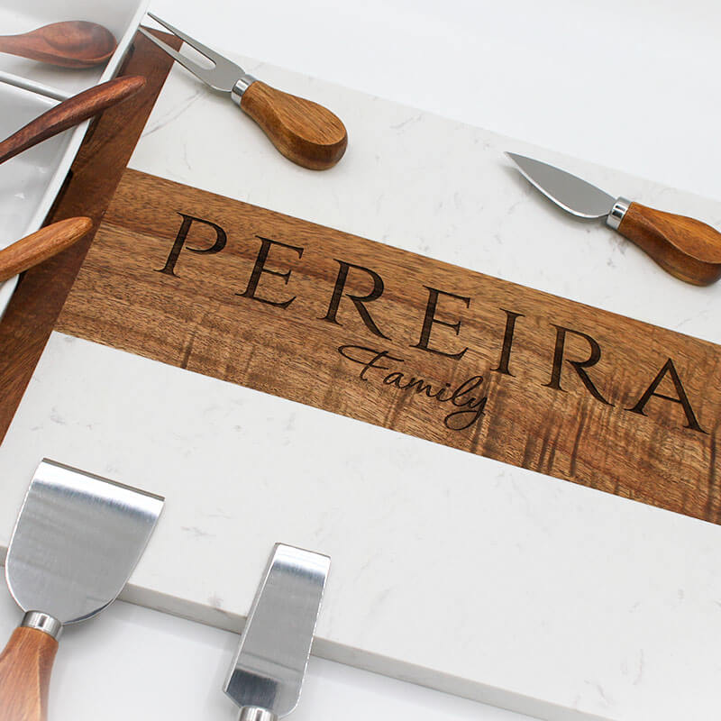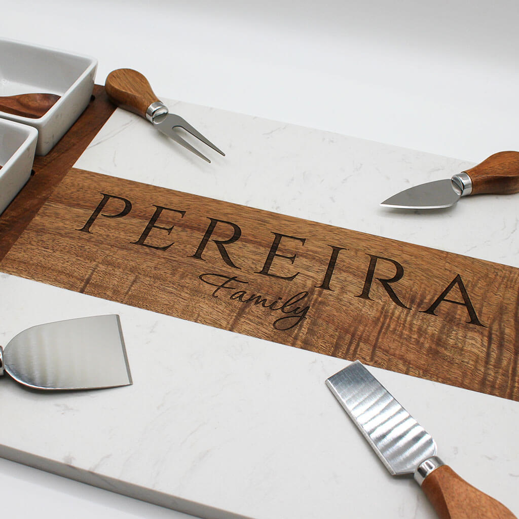 Create a beautiful centerpiece with our custom family charcuterie board set. Each board is made to order and engraved with your name + “Family” for a timeless, personal touch. Includes four cheese knives, ceramic bowls, and wooden spoons. Perfect for hosting, gifting, or everyday use.
